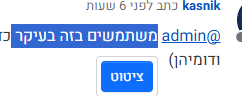 כשרוצים שמשתמש מסויים יקבל התראה על תגובה ששלחתם לו, או על עזרה שאתם מבקשים ממנו, תוכלו לעשות זאת ע"י הוספת @ לפני שם המשתמש. לדוגמא: @יצחק ותראו שהצבע הפך לכחול, ובכך המשתמש יקבל התראה. שימו לב באם למשתמש יש שם עם 2 מילים, הכניסו מקף כזה - בין מילה למילה ללא רווח, וכן אם אתם רוצים לתייג משתמש באמצע מילה כמו “ש@יצחק” או “ל@יצחק” ,יש צורך להכניס רווח בין האות ל-@ ויצא "ש @יצחק " אחרת המשתמש לא יתוייג.