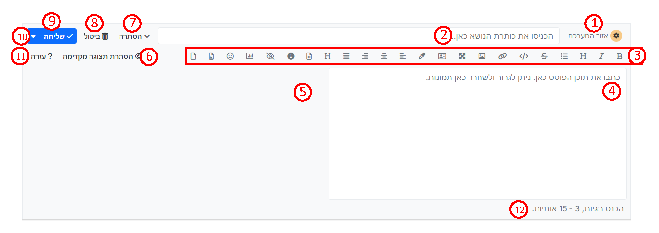 2. כאן כתבו את כותרת הנושא שלכם - יופיע רק בפתיחת נושא חדש. בכתיבת הודעה בנושא קיים תופיע כאן הכותרת של הנושא הקיים.