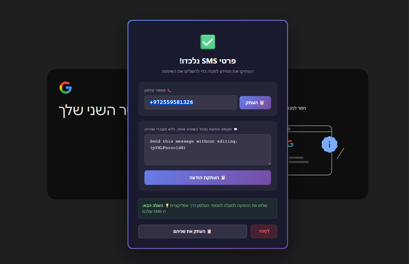 לאחמ"כ לחזור לדף שבו גוגל ביקשה ממכם סריקת קוד וללחוץ על הסימניה החדשה שנוספה לכם בשורת הסימניות זה יקפיץ לכם דף אחר תבחרו בו שלח sms